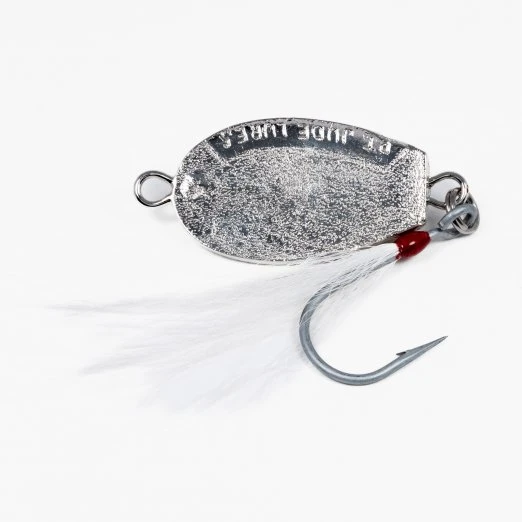 Point Jude Butterfish lures are designed to flutter down in the water column, but can also be skipped across the surface to imitate a baitfish in distress when reeled at high speeds. They are available in 1.5, 2, and 2.5 oz and come with a single heavy duty siwash hook adorned with a flashy white bucktail.