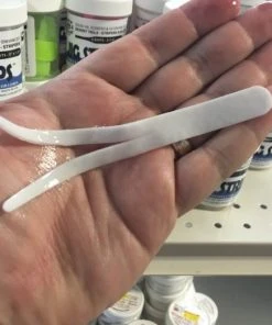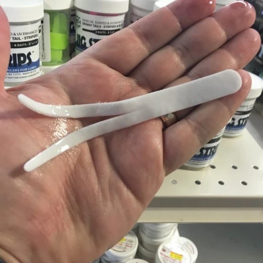 Fat Cow Split Tail Jig Strips are available in two great colors. If you’re not sure which to choose, go with white. They measure 5″ x 1/2″. Made in the USA!